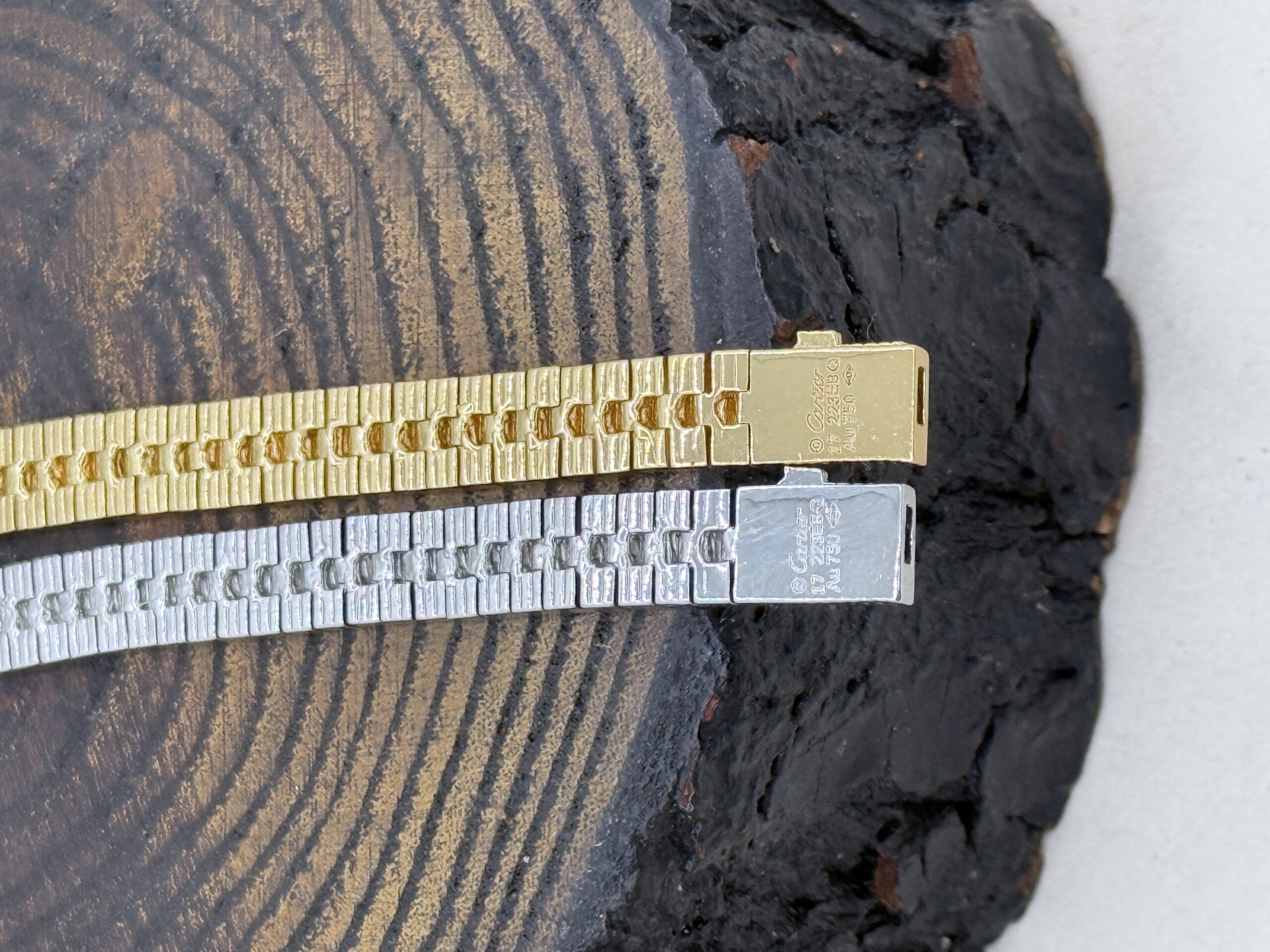 بر روی این دستبند، حک ظریف و دقیق CARTIER 750 درج شده که نشاندهنده توجه به جزئیات و کیفیت بالای ساخت است. این حک حرفهای، حس داشتن یک زیورآلات برند و اصل را به شما منتقل میکند و ارزش ظاهری محصول را چند برابر میسازد.